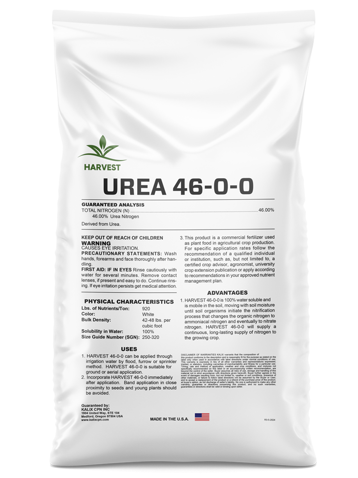 1. HARVEST 46-0-0 is 100% water soluble and is mobile in the soil, moving with soil moisture until soil organisms initiate the nitrification process that changes the organic nitrogen to ammoniacal nitrogen and eventually to nitrate nitrogen. HARVEST 46-0-0 will supply a continuous, long-lasting supply of nitrogen to the growing crop.