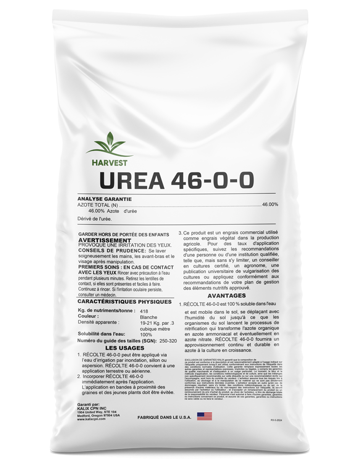 1. HARVEST 46-0-0 est 100 % soluble dans l'eau et est mobile dans le sol, se déplaçant avec l'humidité du sol jusqu'à ce que les organismes du sol lancent le processus de nitrification qui transforme l'azote organique en azote ammoniacal et éventuellement en azote nitrate. HARVEST 46-0-0 fournira un approvisionnement continu et durable en azote à la culture en croissance.
